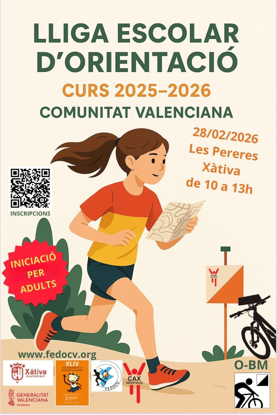 El pròxim dissabte 28 de febrer de 2026, el CAX Orientació organitza a Xàtiva una nova cita de la Lliga Escolar d’Orientació (Zona Nord) dins dels XLIV Jocs Esportius de la Comunitat Valenciana. L’activitat es desenvoluparà de 10:00 a 13:00 h a la Ciutat de l’Esport – Poliesportiu Les Pereres, un entorn ideal per a descobrir l’orientació en un format dinàmic, segur i molt divertit.